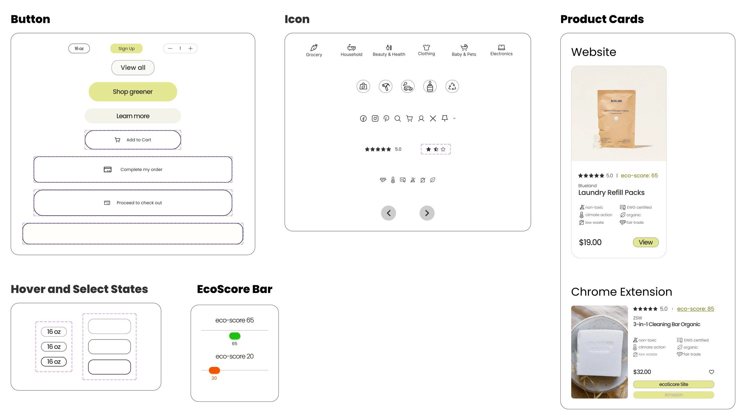 Moderated usability tests with 5 participants were conducted via Google Meet to evaluate ecoScore's usability. Key goals included pinpointing task completion barriers & user pain points, gathering user feedback on overall functionality, visual design, and user flow efficiency for the Chrome extension, website, and purchase task. Click the links for full Usability Test Plan; Usability Test Report; Usability Test Affinity Map.