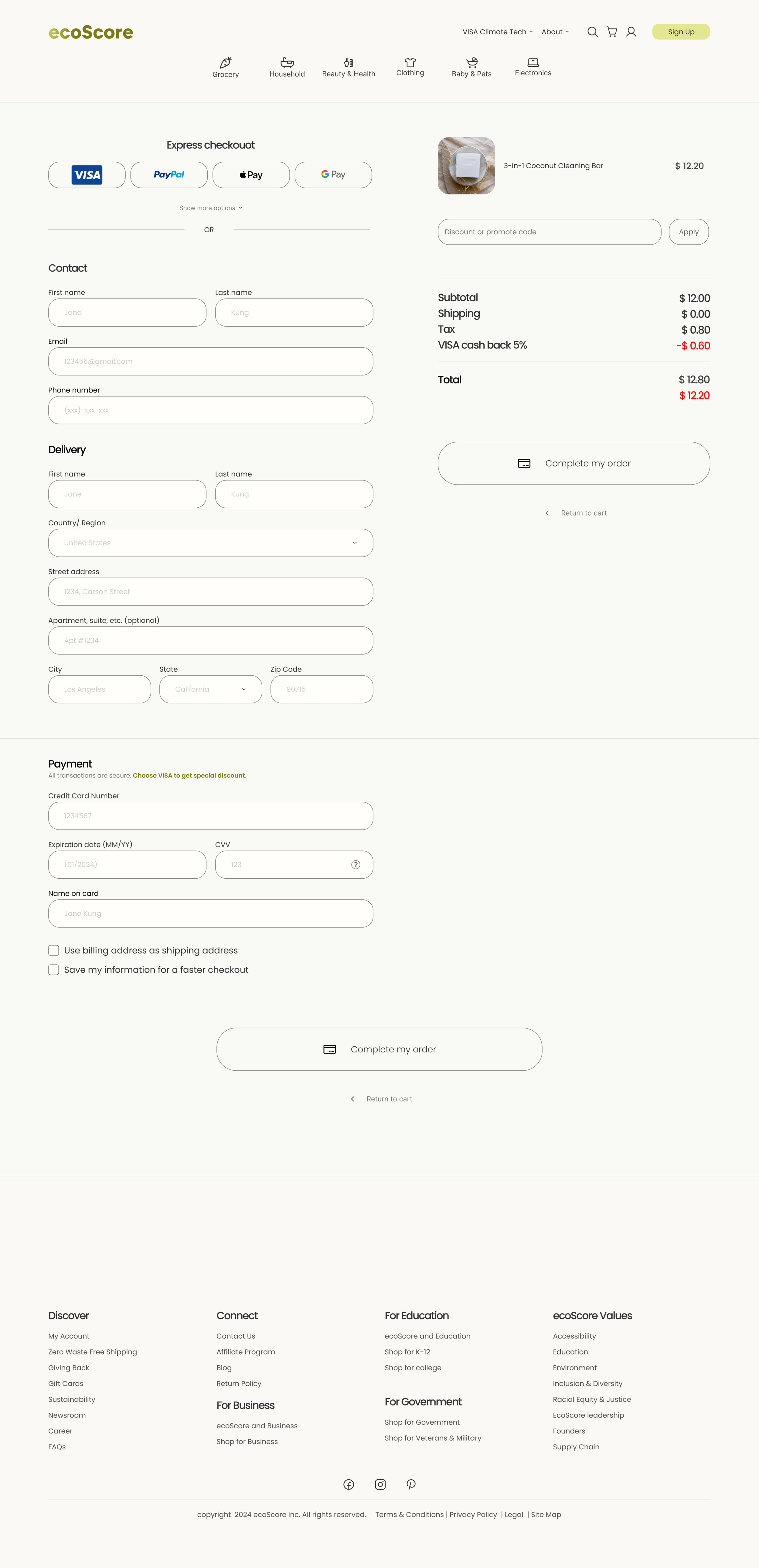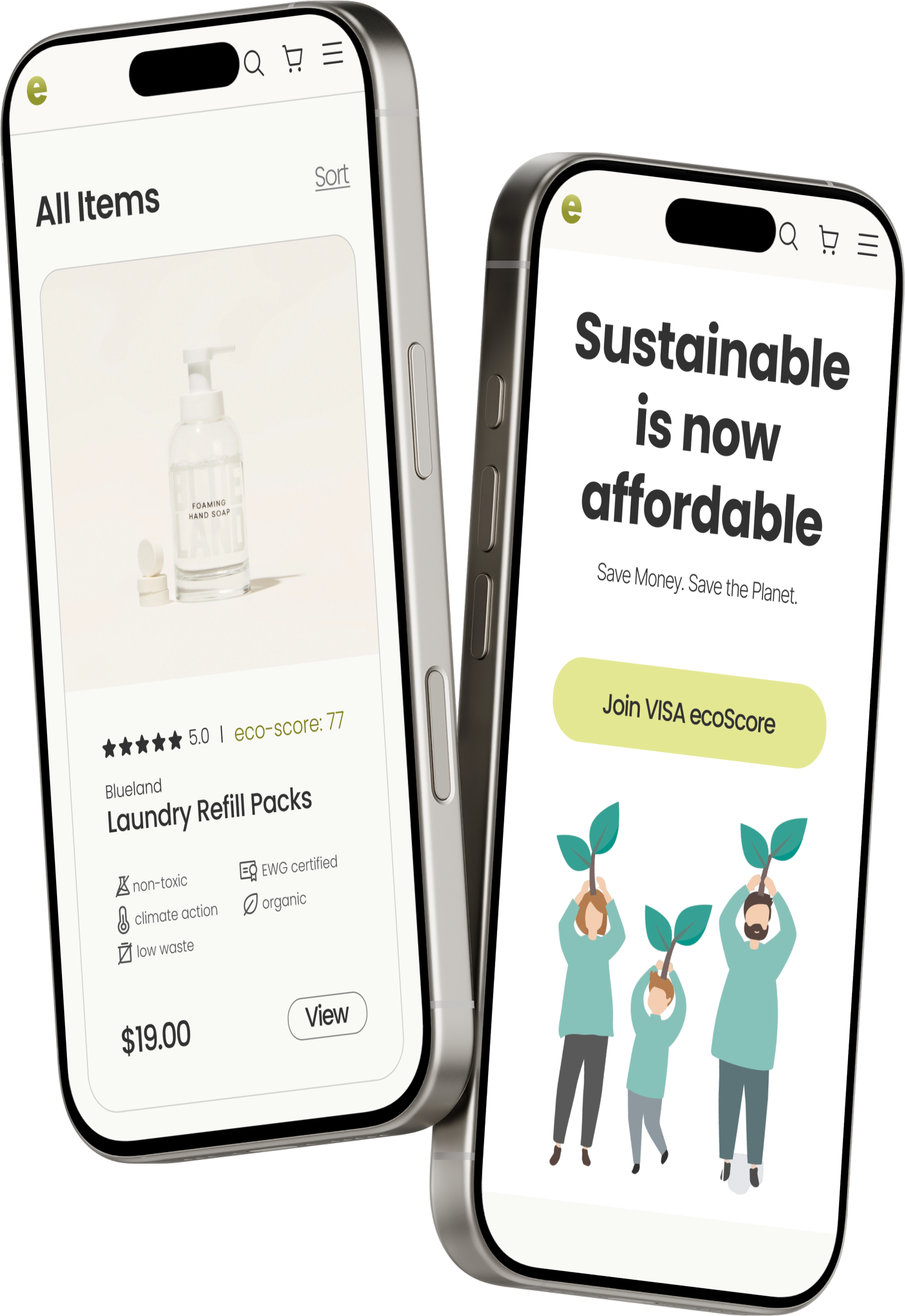 Leveraging machine learning, VISA spending data, and our own research, we developed ecoScore—a Chrome extension powered by an ML algorithm for real-time sustainability ratings and VISA-sponsored e-commerce platform, during online shopping. It also guides users to discounted, eco-friendly alternatives.