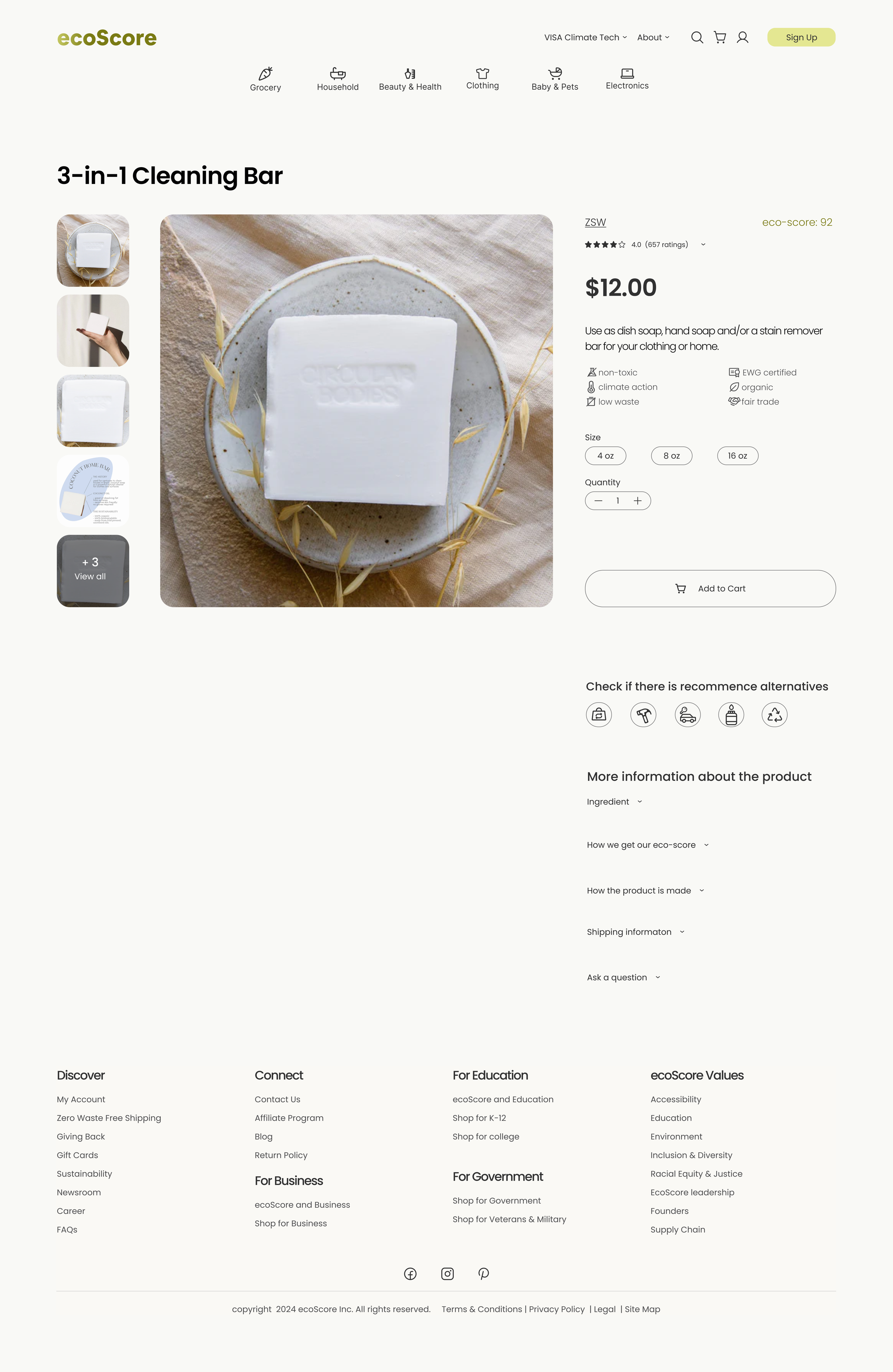 The ecoScore platform promotes sustainable shopping through a Chrome extension that integrates with major e-commerce sites like Amazon. On product page, we used an ML algorithm to provide real-time sustainability ratings based on recognized systems like Environmental, Social, and Governance (ESG) score, guides users toward eco-friendly choices on both the ecoScore website and their preferred shopping platforms. Additionally, the ecoScore website features high-spending product categories, scientific insights, and VISA sponsorship to support informed, sustainable purchasing decisions.